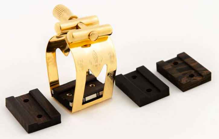 Following the introduction of his original model, Marc has released the second version, aka the “Woodstock version” (see photo below), which has a very thick piece of grenadilla wood as the plate and leverages one screw to loosen and tighten the ligature. Since the release of the Gen II model, Marc has just recently released his newest ligature which he is calling the Marc Jean Evolution 4. The Marc Jean Evolution 4 looks very similar to the Gen II, however, this ligature leverages German Hard Rubber on the reed plate instead of grenadilla wood.